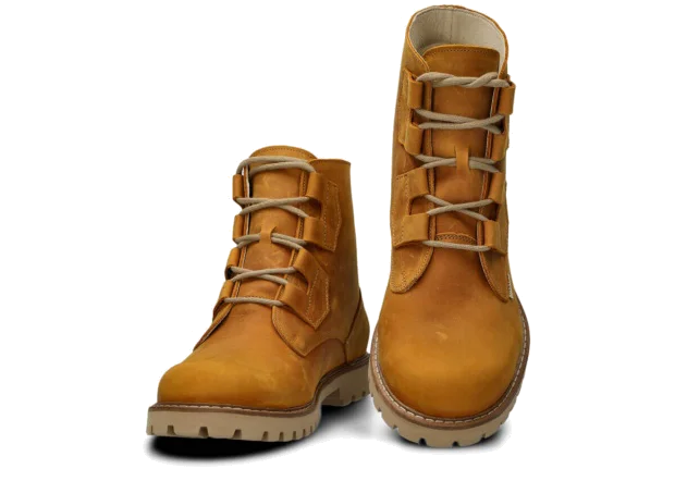 Crazy - fleischiges, dickes Vollnarbenleder. Die Narbenseite ist geölt (mit Wachs oder Fett). Sehr strapazierfähiges Leder, daher oft für die Herstellung von Trekking-, Trapper- und massiven Stiefeln verwendet. Das Leder hat charakteristische dunkle, fettige Flecken, die sich an einigen Stellen zur Grundfarbe hin ausdehnen und an anderen dunkel bleiben. Häufig hat das Leder Kratzer, Abschürfungen und Verfärbungen, die es einzigartig machen.