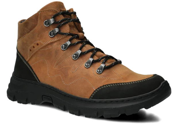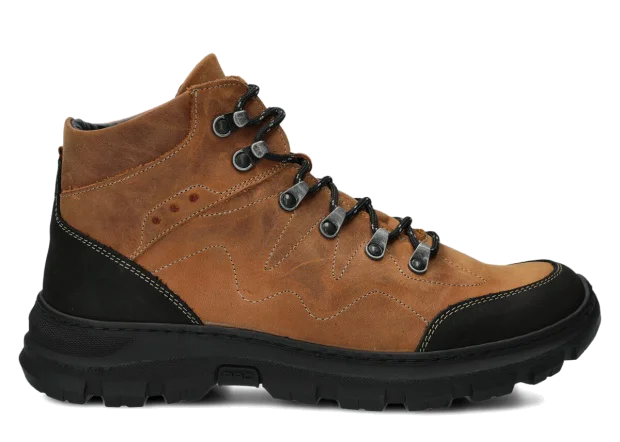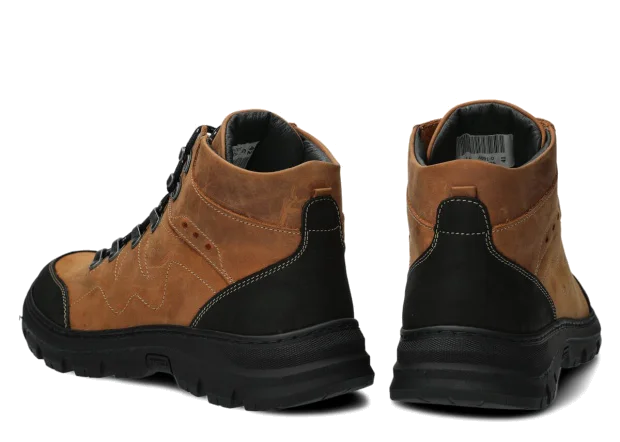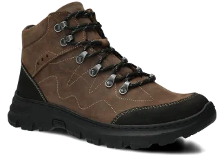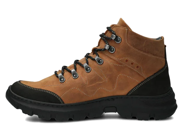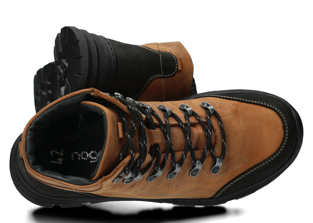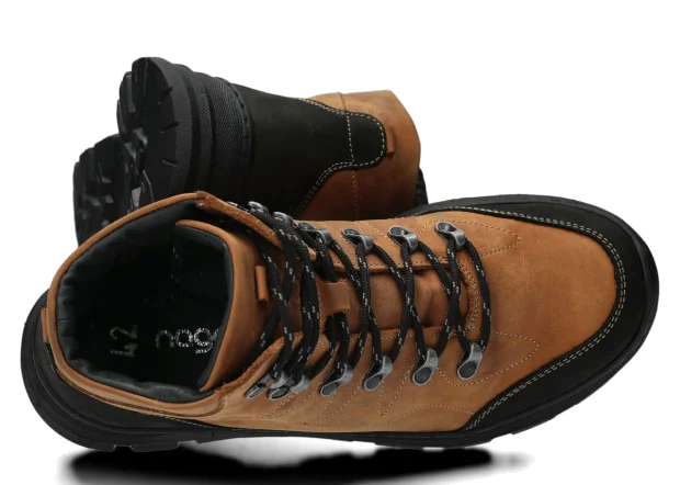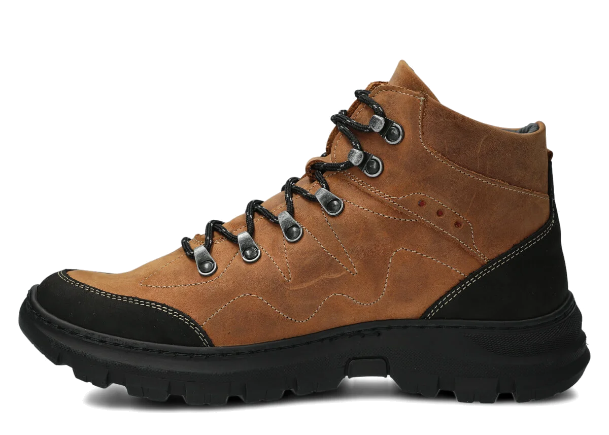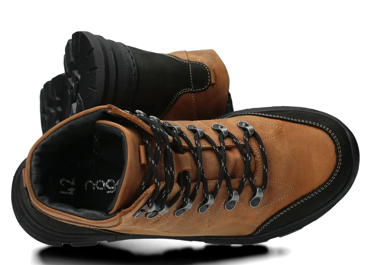 Herren Trekkingstiefel Leder Nagaba 4091 Braun Crazy sind ein Meisterwerk handwerklicher Kunst – handgefertigt in Polen aus strapazierfähigem natürlichem Crazy-Horse-Leder. Knöchelhohe Schuhe mit wählbarer Isolierung (Filz oder Leder) und rutschfester TR-Thermoplast-Gummisohle – ideal für Herbst, Winter und Frühling. Die dominante Braunfarbe mit schwarzen Akzenten an Zehenkappe und Ferse, schwarzen Schnürsenkeln und schwarzer Sohle erzeugen einen modernen, outdoorigen Look.