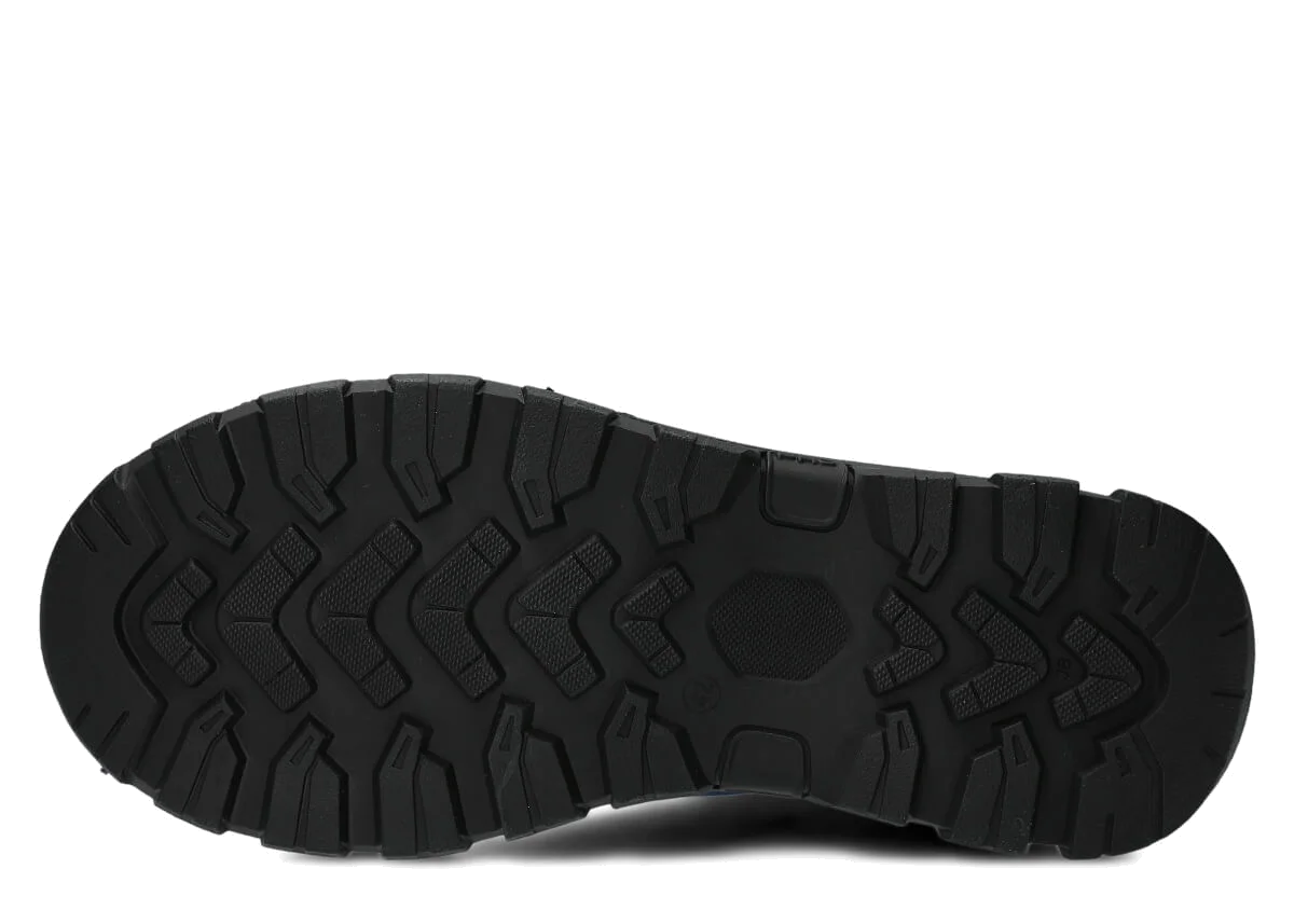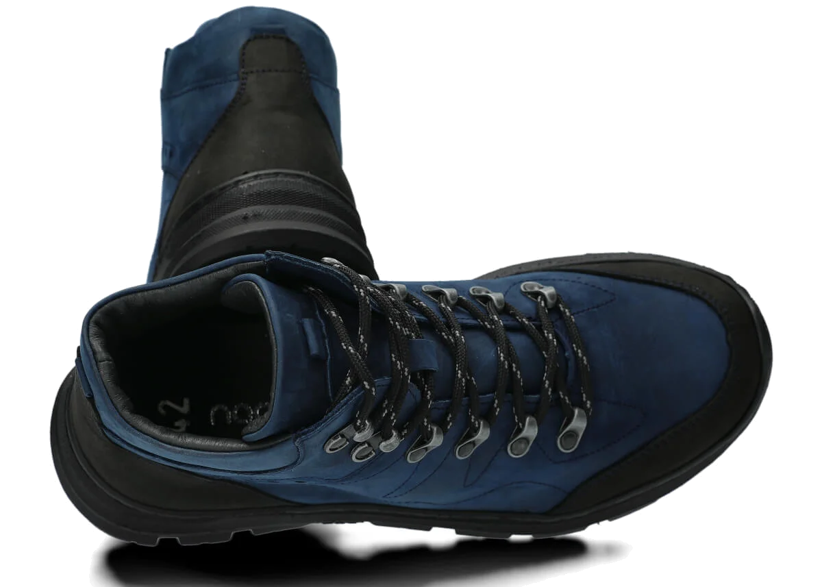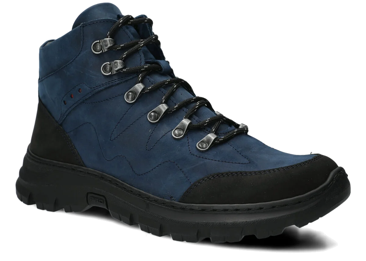 Herren Trekkingstiefel Leder Nagaba 4091 Dunkelblau Crazy sind ein Meisterwerk handwerklicher Kunst – handgefertigt in Polen aus strapazierfähigem natürlichem Crazy-Horse-Leder. Knöchelhohe Schuhe mit wählbarer Isolierung (Filz oder Leder) und rutschfester TR-Thermoplast-Gummisohle – ideal für Herbst, Winter und Frühling. Die dominante Dunkelblaufarbe mit schwarzen Akzenten an Zehenkappe und Ferse, schwarzen Schnürsenkeln und schwarzer Sohle erzeugen einen modernen, outdoorigen Look.