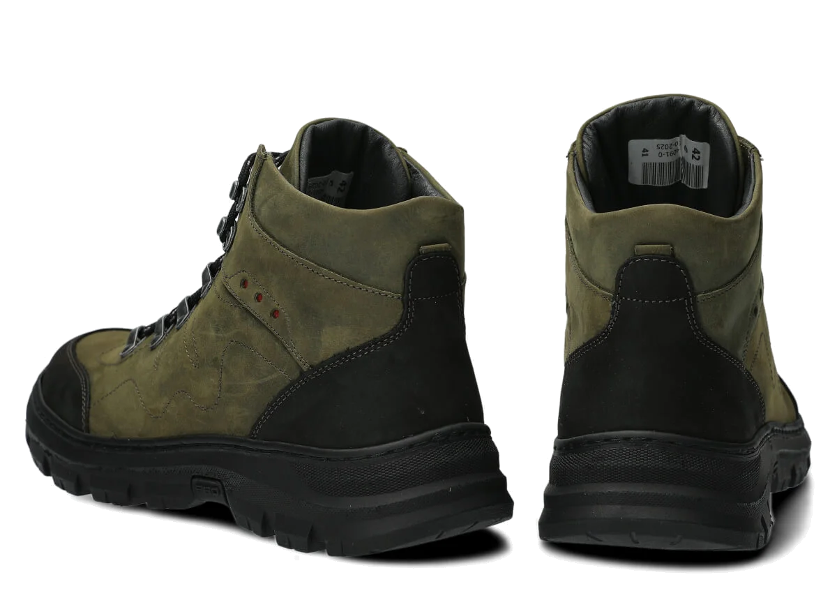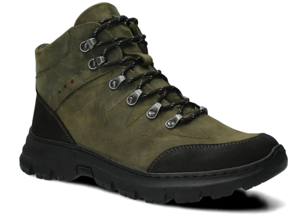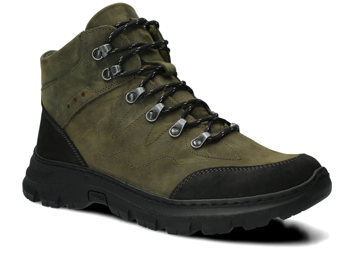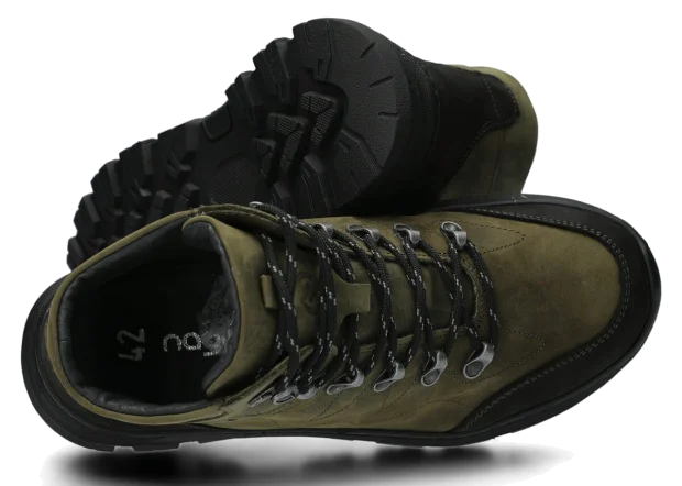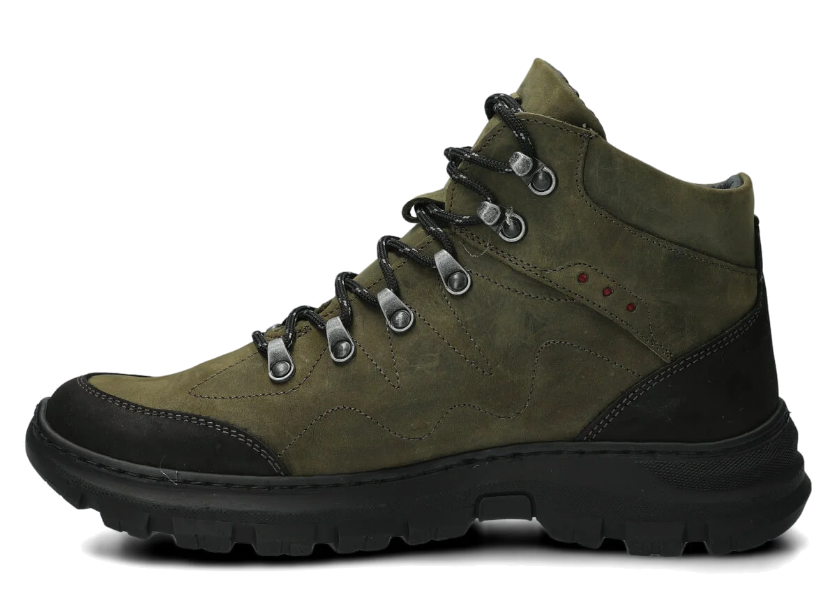 Herren Trekkingstiefel Leder Nagaba 4091 Olivgrün Crazy sind ein Meisterwerk handwerklicher Kunst – handgefertigt in Polen aus strapazierfähigem natürlichem Crazy-Horse-Leder. Knöchelhohe Schuhe mit wählbarer Isolierung (Filz oder Leder) und rutschfester TR-Thermoplast-Gummisohle – ideal für Herbst, Winter und Frühling. Die dominante Olivgrünfarbe mit schwarzen Akzenten an Zehenkappe und Ferse, schwarzen Schnürsenkeln und schwarzer Sohle erzeugen einen modernen, outdoorigen Look.
