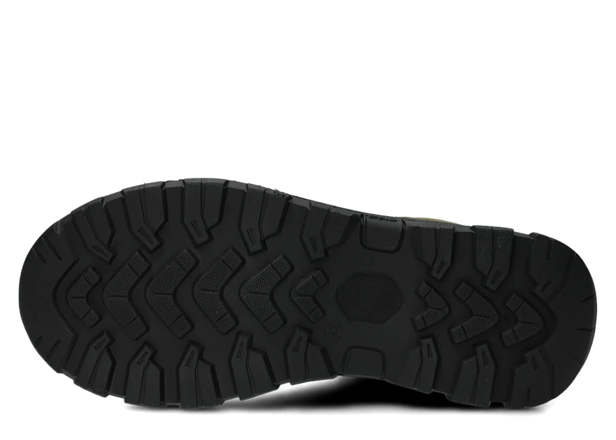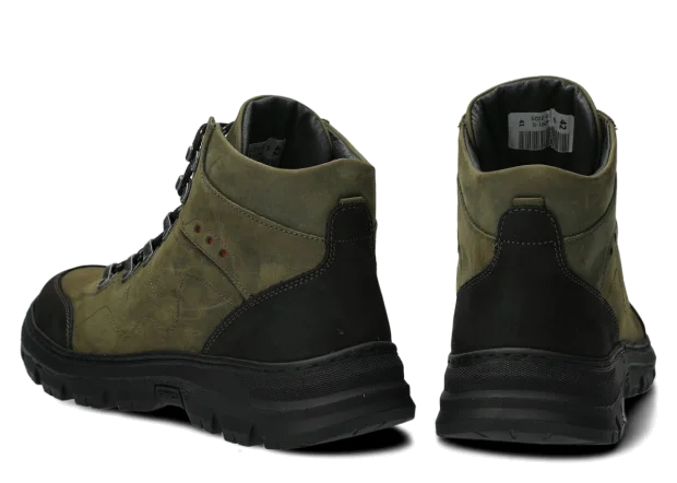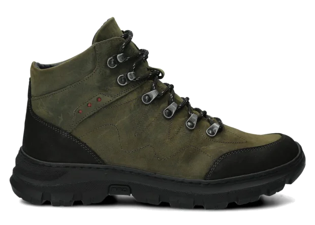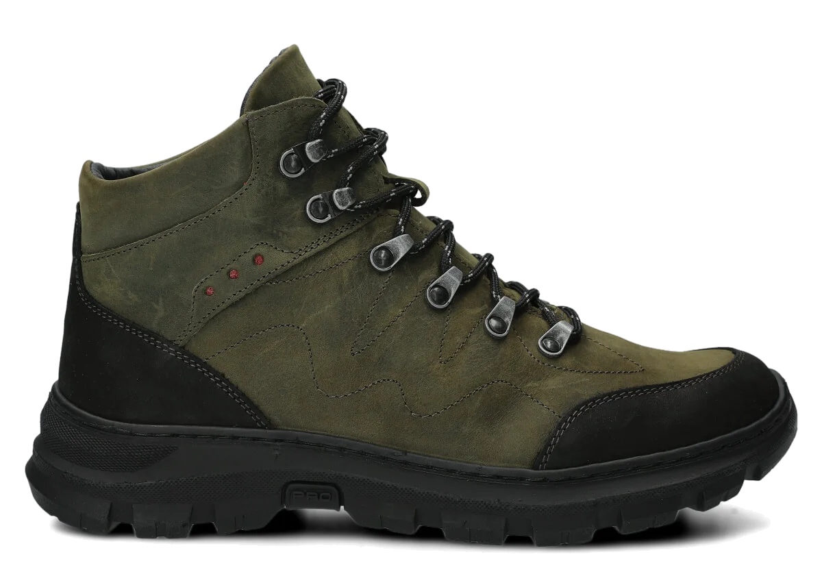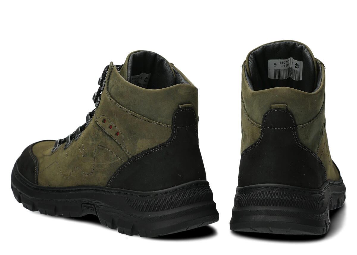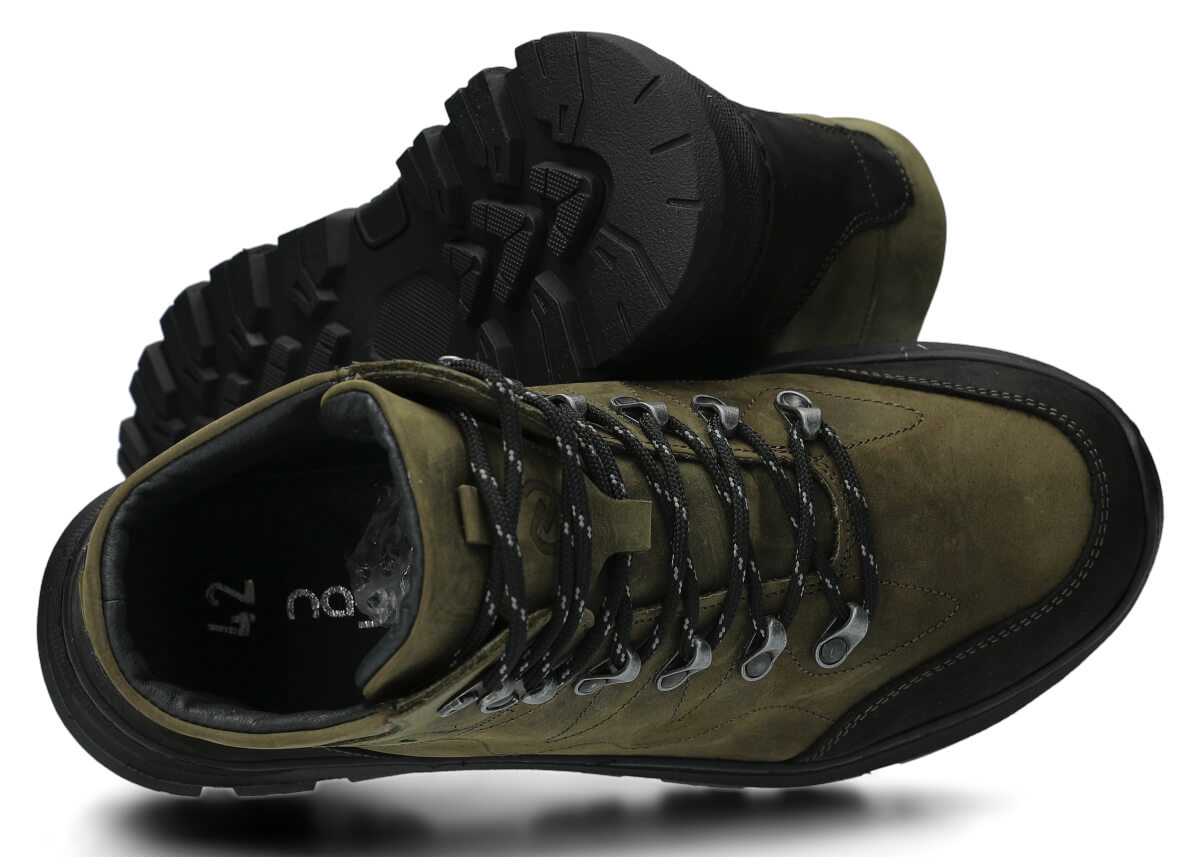 Herren Trekkingstiefel Leder Nagaba 4091 Olivgrün Crazy sind ein Meisterwerk handwerklicher Kunst – handgefertigt in Polen aus strapazierfähigem natürlichem Crazy-Horse-Leder. Knöchelhohe Schuhe mit wählbarer Isolierung (Filz oder Leder) und rutschfester TR-Thermoplast-Gummisohle – ideal für Herbst, Winter und Frühling. Die dominante Olivgrünfarbe mit schwarzen Akzenten an Zehenkappe und Ferse, schwarzen Schnürsenkeln und schwarzer Sohle erzeugen einen modernen, outdoorigen Look.