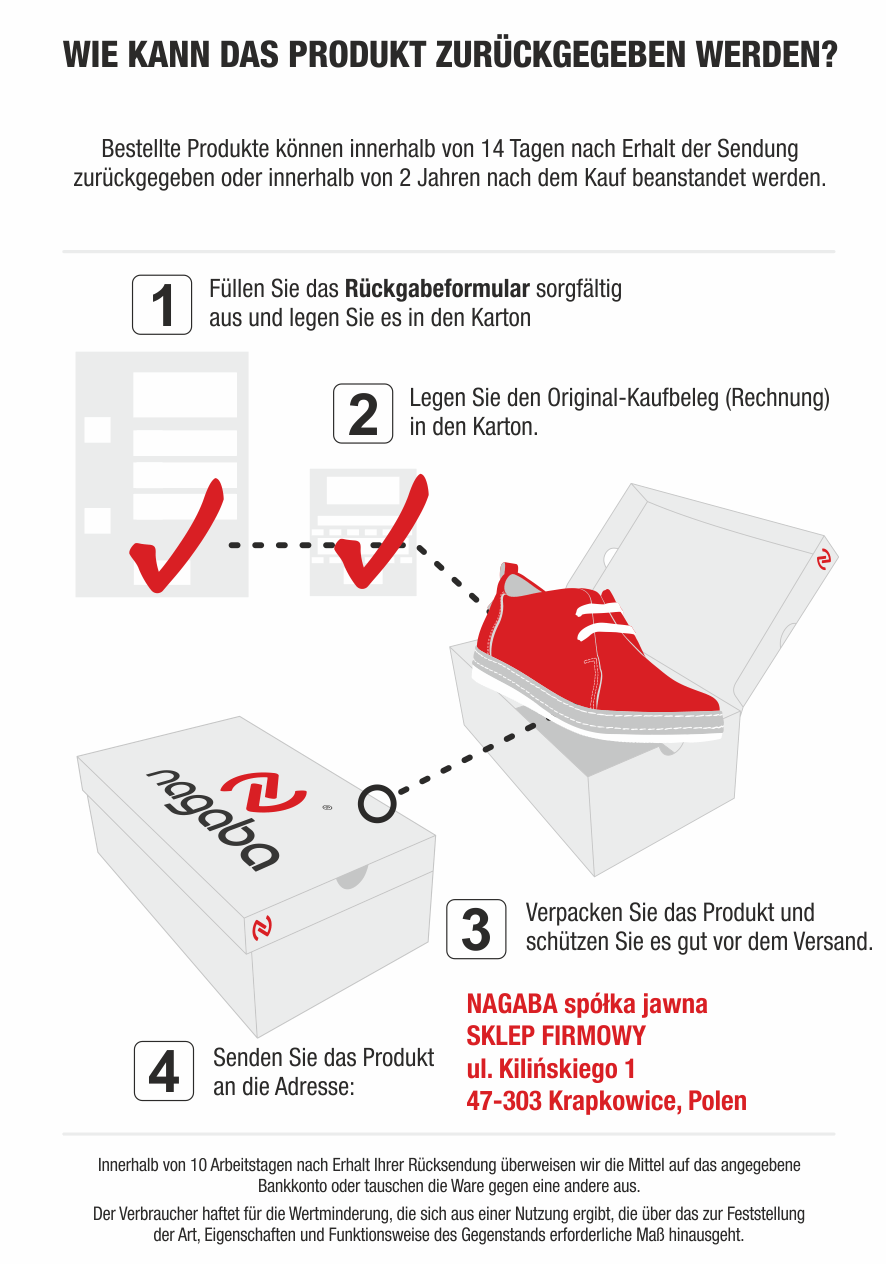 NAGABA spółka jawna, SKLEP FIRMOWY, ul. Kilińskiego 1, 47-303 Krapkowice, Polen. Dem zurückgesandten Produkt sollten ein Kaufbeleg und eine Beschreibung des Produktmangels mit Überschrift „Reklamation“ und den Kontaktdaten beigefügt werden. Für die Reklamation akzeptieren wir nur saubere Schuhe!